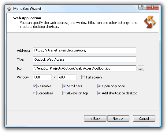 With MenuBox and its one-click Web Application wizard option you can easily wrap sites and services such as Outlook Web Access, Google Mail and Calendar, Facebook, etc. into independent application windows that can be used outside of the browser.
