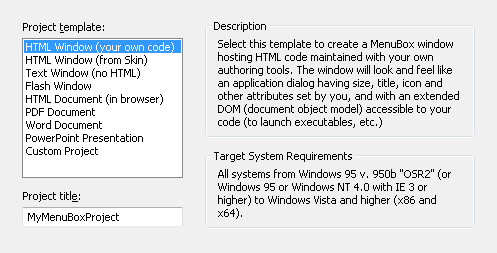 While you may create or edit a MenuBox project with as little as a text editor, you can use the MenuBox Wizard for a guided setup. The MenuBox Wizard includes preset templates to easily build different types of projects, which can then be further edited with a text editor, an HTML editor, etc.